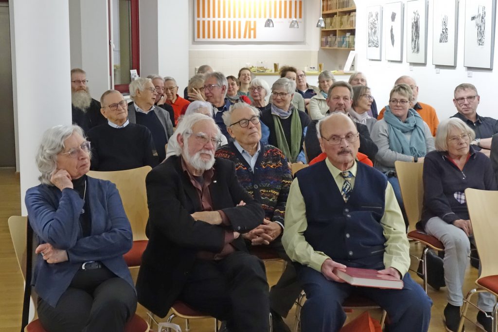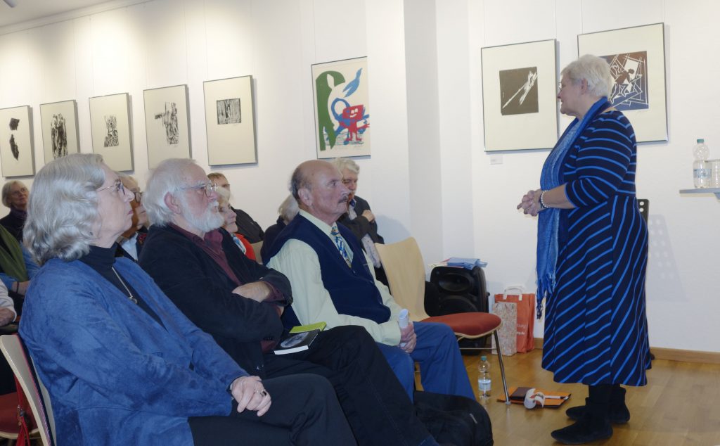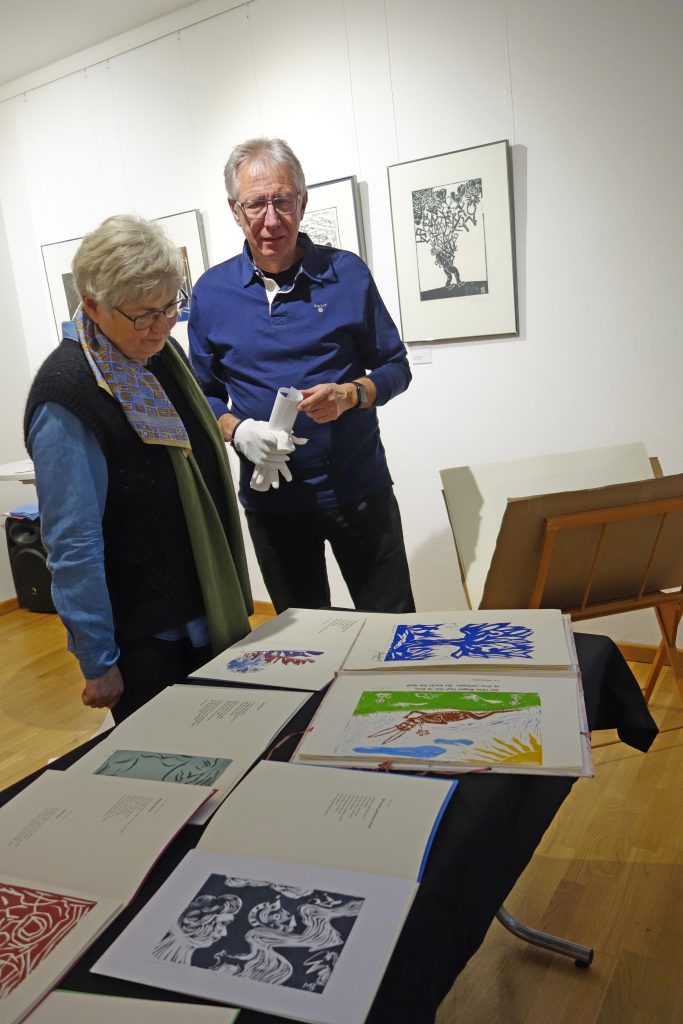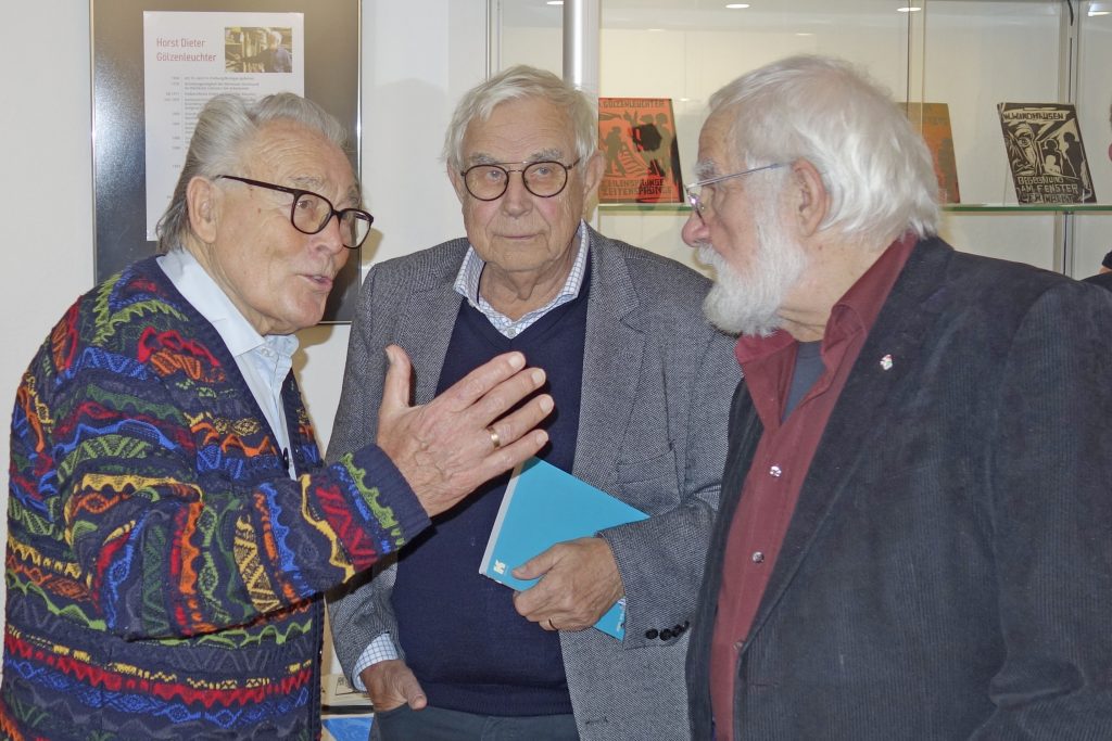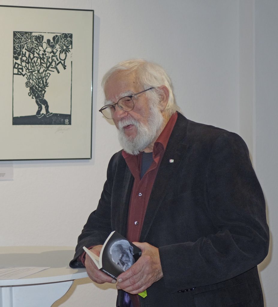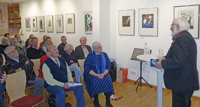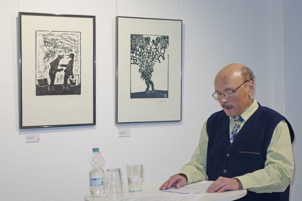 Einen fundierten Einblick in das Schaffen des Künstlers vermittelte Dr. Gerd Gruber, der in die Ausstellung mit seinem Vortrag einführte. Ihn verbindet eine 50-jährige Freundschaft mit Horst Dieter Gölzenleucher. Er beleuchtete nicht nur die künstlerischen Aspekte des Schaffens von Gölzenleuchter, sondern auch dessen politisches Engagement. Er habe zwar 1975 den Radierzyklus „Der Künstler in der Gesellschaft“, darunter das Blatt „Der Künstler im Elfenbeinturm“, geschaffen, so Gruber, aber „nein, ein solcher Künstler wollte Gölzenleuchter niemals sein. Er will wirken in der Zeit, so wie es die Kollwitz, eines seiner großen Vorbilder, einmal sagte.“ Gölzenleuchter ging mit seinen politischen und künstlerischen Sichtweisen nicht nur mittels eigener Ausstellungen in die Öffentlichkeit, er war auch Mitorganisator zentraler Ausstellungen, wie solchen in Erinnerung an Carl von Ossietzky, über die Bücherverbrennung der Nazis, zum Bergbau im Spiegel der Bildenden Kunst und „Vom Schmerz der Geschichte“ – eine Ausstellung gegen Nationalismus und Rassismus, so Gruber. Bereits Ende der 1980er Jahre drückte Gölzenleuchter seine „Verantwortung für die Umwelt“ künstlerisch aus, wie die Holzschnitte „Baum/Mann“, „Baum/Paar“, „Baum/Frau“ (in der Ausstellung zu sehen) und zeigen.
