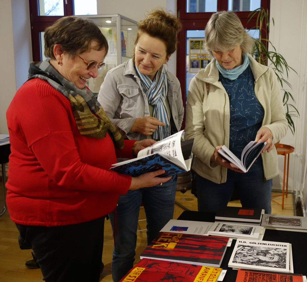 Diese Aufzählung der Professionen, die Horst Dieter Gölzenleuchter zugeschrieben werden, zeigen die Vielseitigkeit des Künstlers, die sich adäquat in seinem umfangreichen Werk widerspiegelt. Zwar kann die Ausstellung im Literaturhaus nur einen Ausschnitt aus seinem Oeuvre zeigen, dafür gelingt es ihr, diesen Ausschnitt so breit zu fächern, dass die Besucher einen fundierten Eindruck des Gesamtwerkes bekommen. Das reicht von den Anfängen des künstlerischen Schaffens von Gözenleuchter, die mit der von ihm 1968 gegründeten „Proletenpresse“ verbunden ist, über die „Edition Wort und Bild“, die er 1979 ins Leben gerufen hat, bis hin zu aktuellen Werken.