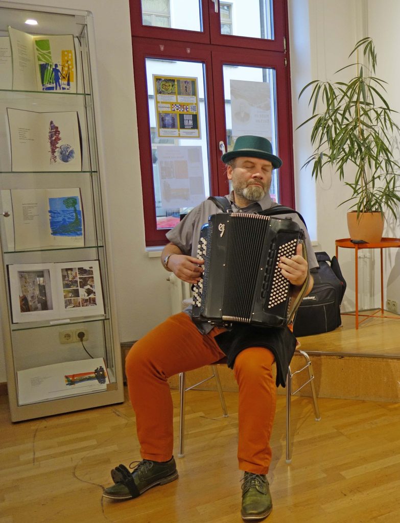 Vereinsvorsitzende Sigrid Wege bedankte sich zum Schluss mit einem kleinen Präsent bei Laudator Gerd Gruber, bei Martin Müller, der die Eröffnung mit seinem Akkordeon musikalisch begleitet hat, sowie dem Kulturbüro der Landeshauptstadt Magdeburg, dem Literaturhausverein sowie der Pirckheimer-Gesellschaft für die Unterstützung. Die Ausstellung ist noch bis zum 16. Januar 2026 im Literaturhaus zu sehen.